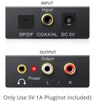 Convierte señales de audio digital coaxial o toslink a audio analógico L / R y se conecta a un dispositivo externo como un amplificador a través de conectores RCA estándar.